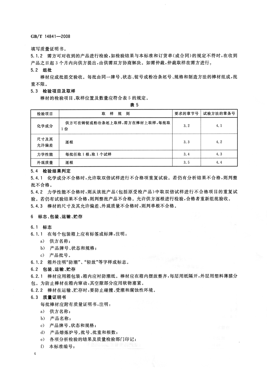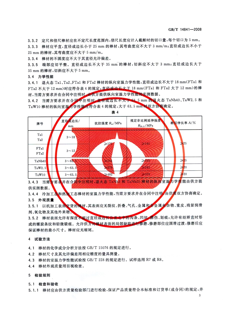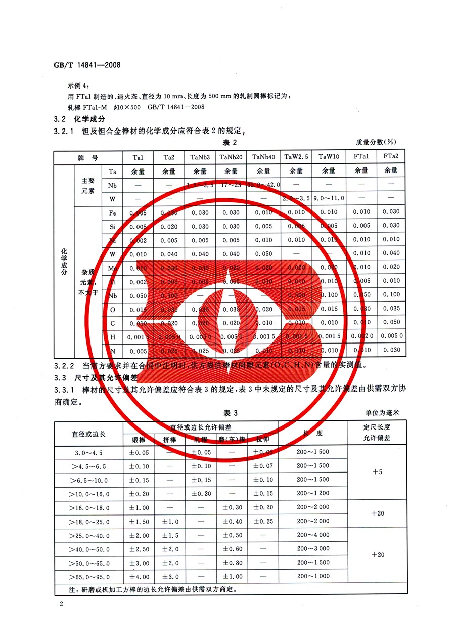 鉭棒材 GB/T 14841-2008國家標準